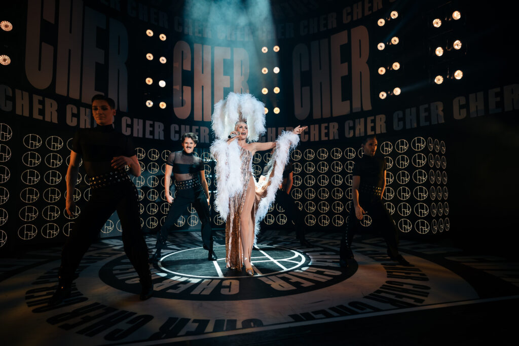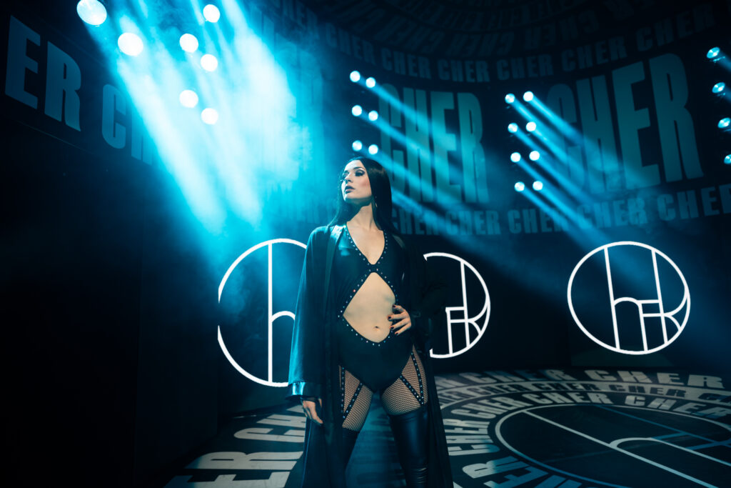 Wer sich als Besucher für den unwahrscheinlichen Fall fragt, in welcher Show er sich gerade befindet, dem hilft das Bühnenbild auf die Sprünge: CHER. Überall CHER. Der Name prangt in monumentalen Lettern auf LED-Wänden, wölbt sich tunnelförmig in die Tiefe. Ein zentrales Rahmenelement aus weißem Licht fasst die Bühne wie ein gigantisches Proszenium: ein Portal in die Welt der Ikone. Ach ja, es geht übrigens um Cheryl Sarkisian, besser bekannt als C-H-E-R.