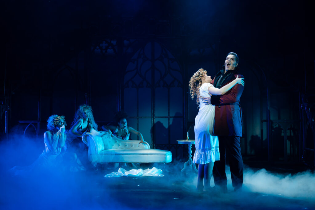 Sam Madwars Bühnenbild ist durchaus ansehnlich, mit viktorianischen Elementen und gotischen Bögen, doch all diese visuellen Elemente bleiben oberflächlich. Es fehlt die Konsequenz und Radikalität, die ein Mythos wie Dracula braucht. Das Lichtdesign von Michael Grundner wirkt willkürlich; entscheidende Momente gehen in diffuser Beleuchtung unter, während unwichtige Szenen überbeleuchtet werden. Dennis Heises Sounddesign ist das akustische Äquivalent dazu: undifferenziert und dumpf. Die achtkopfige Live-Band klingt wie durch Watte gefiltert, Feinheiten in der Orchestrierung gehen verloren, die Balance zwischen Gesang und Instrumenten stimmt nicht – gerade bei einem Komponisten wie Wildhorn, dessen Stärke in melodiösen Balladen liegt, ist das fatal.