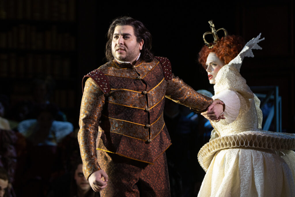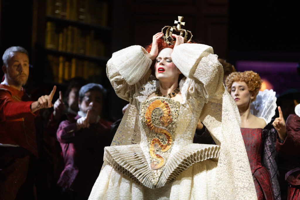 Nikolaus Weberns Ausstattung der Turandot Produktion am Staatstheater Nürnberg ist von berauschender Bildkraft. Zwischen Tudor-Pracht und surrealem Traum entfaltet die Bühne eine Tiefe und Vieldeutigkeit. Constanza Meza-Lopehándias Kostüme verdienen das Adjektiv verschwenderisch im besten Sinne: Halskrausen, Reifröcke, bestickte Mäntel, Silhouetten des Tudor-England, die die Körper in eine Kleidergeschichte des Weiblichen und Mächtigen einhüllen. Das Auge kann gar nicht aufhören zu wandern und zu sehen.
