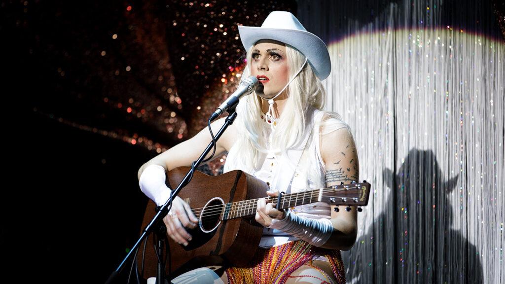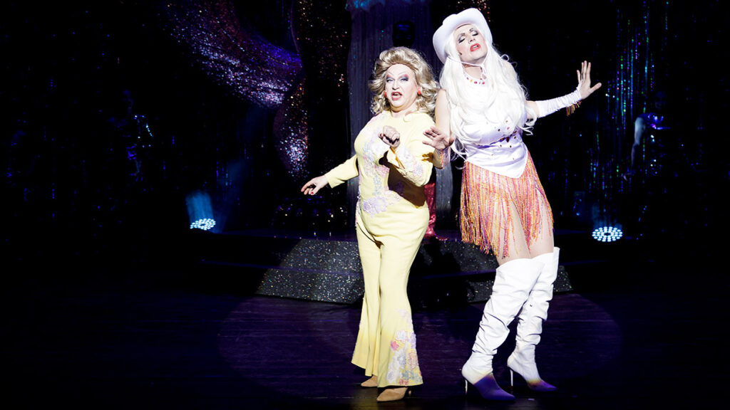 Anette Hachmanns Bühne und Kostüme schaffen eine Welt, die zwischen Tristesse und Glamour changiert: Die heruntergekommene Bar am Panama Beach, in der Casey seine Elvis-Nummer zum Besten gibt, ist trostlos genug, um die Verzweiflung der Figur spürbar zu machen, aber nie so deprimierend, dass sie die Komödie erdrückt. Im Kontrast dazu stehen die spektakulären Drag-Kostüme: ein Feuerwerk aus Pailletten, Federn, Polyester und Farben. Hachmann versteht es, den ästhetischen Kontrast zwischen Caseys anfänglichem Elvis-Kitsch und der glamourösen Welt der Drag Queens visuell erfahrbar zu machen. Das rote Toxic-Latex-Outfit, eine liebevolle Hommage an Britney Spears‘ legendäres Video, zeigt die Detailverliebtheit dieser Produktion. Jedes Kostüm erzählt von den Ikonen, die Generationen von Drag Queens inspiriert haben: Judy Garland, deren Tod 1969 zeitlich mit Stonewall zusammenfiel und als Auslöser gilt; Cher, die mit ihrem extravaganten Stil und ihrer Unterstützung der LGBTQ+-Community zur Verbündeten wurde; Dolly Parton, deren Camp-Ästhetik und Großzügigkeit sie zur Queer-Ikone machten.